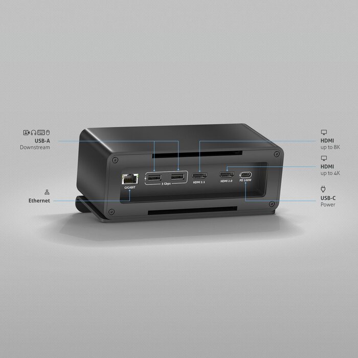 Das mediahub2 Dock ist eine leistungsstarke USB-C-Dockingstation für moderne Arbeitsplätze, die Design und Funktionalität perfekt verbindet. Mit flexiblem 8K/5K- oder Dual-4K-Display-Output, Gigabit-Ethernet, schnellen USB-Anschlüssen und bis zu 100W Power Delivery sorgt es für nahtlose Konnektivität und maximale Effizienz.