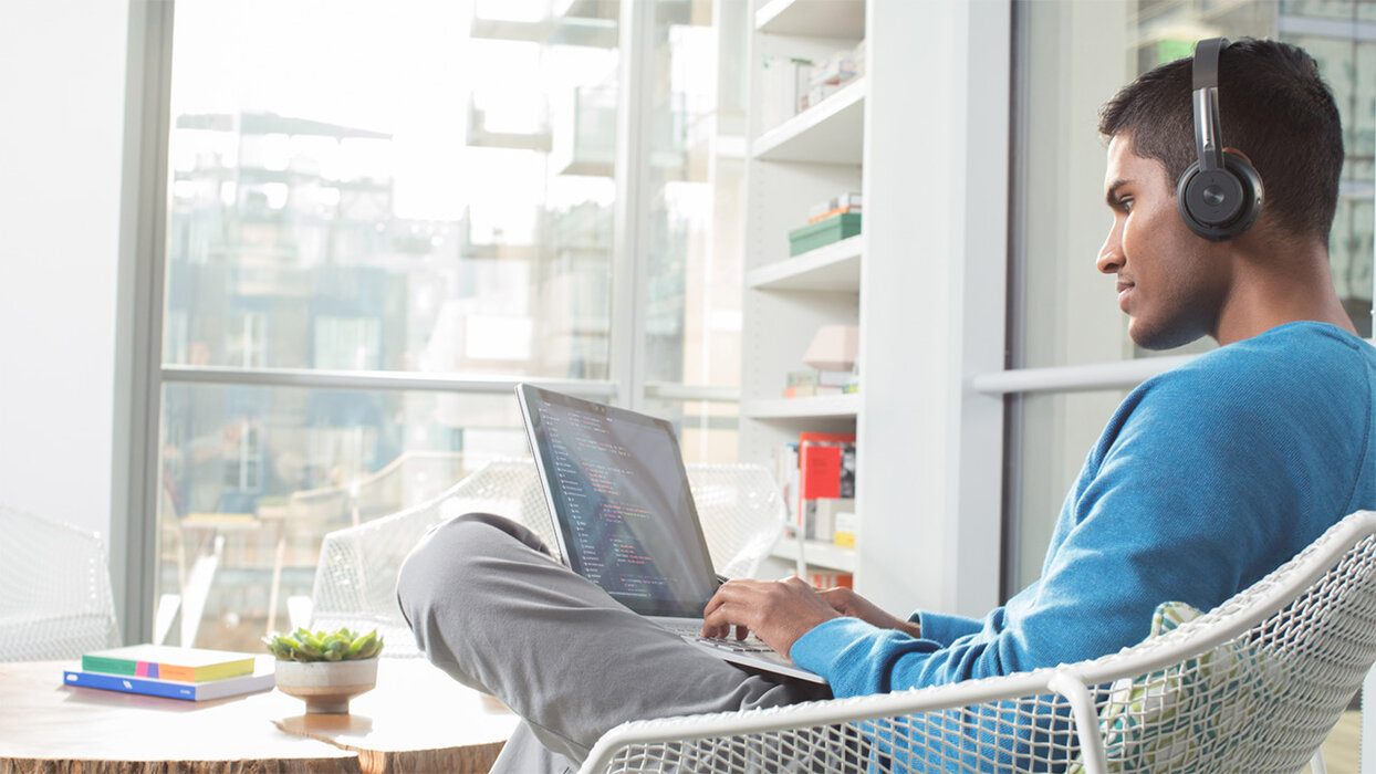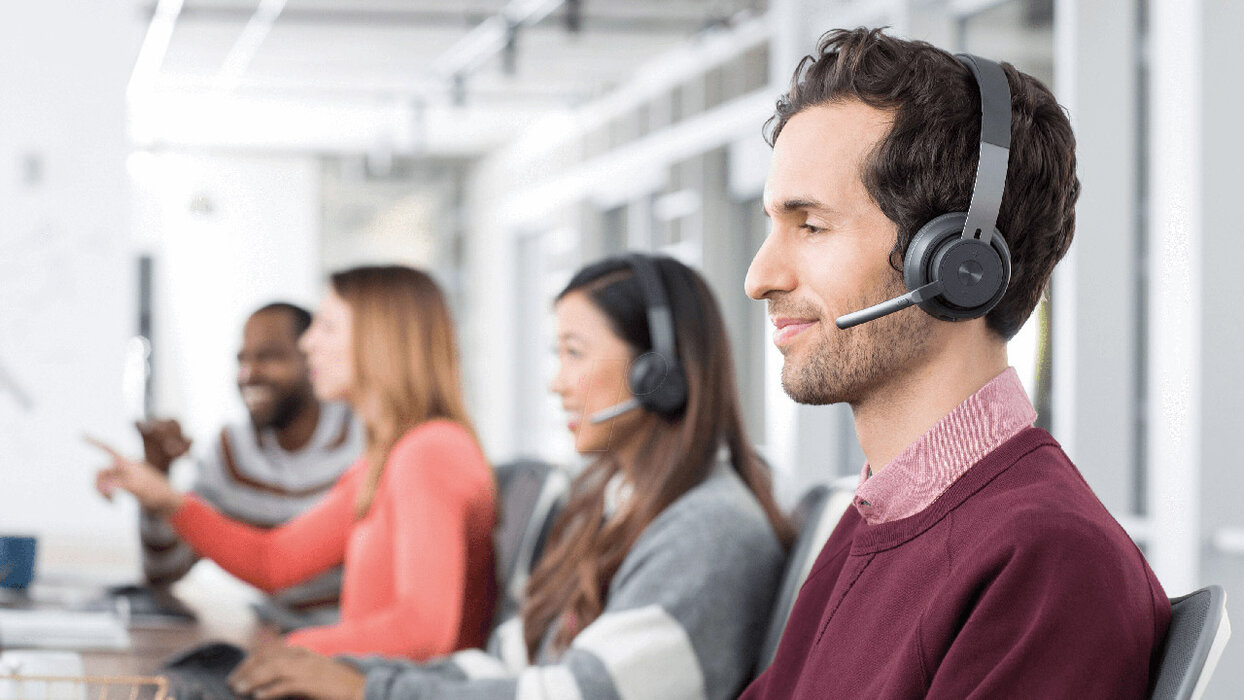 Headset mit Geräuschunterdrückung, das sich ideal für den Einsatz an einem hybriden Arbeitsplatz eignet. Selbst in einer belebten Umgebung bietet das