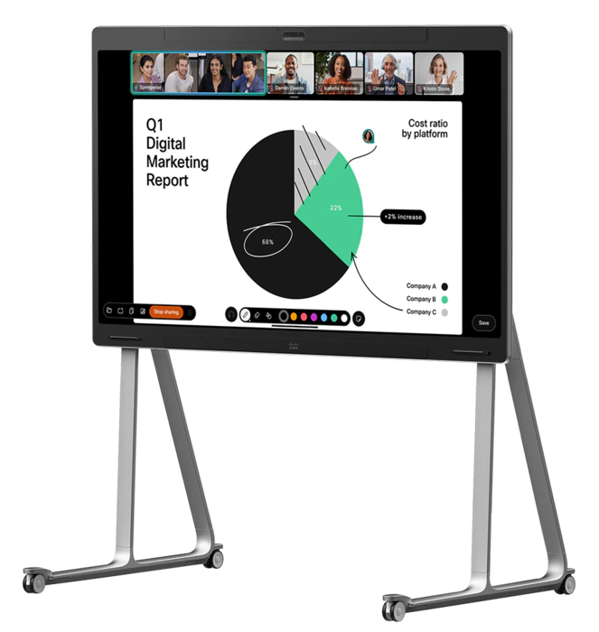 Erhältlich in 55" und 75", ist das Cisco Board Pro G2 Microsoft Teams zertifiziert und zudem mit gängigen Plattformen wie Webex, Zoom und Google Meet kompatibel und bietet eine zukunftssichere und vielseitige Lösung für moderne Konferenzräume.