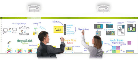 Die HoyluWall ist in 2 verschiedenen Varianten verfügbar. Beide Modelle bestehen aus einer digitalen Folie, Projektoren und einem PC. Bei der einen Ausführung wird die Folie mit einem nicht-wiederholenden Mikropunktmuster (QR-Codes) bedruckt. Der dazugehörige digitale Stift ist mit einer Kamera ausgestattet, welche die QR-Codes lesen kann und somit die Touch-Fähigkeit möglich macht. Die andere Version funktioniert mit einer druckkapazitiven Berührungsschicht, die mit dem nicht-wiederholenden Mikropunktmuster verbunden wird (PCAP). Somit können Sie hier, auch ohne den digitalen Stift, die interaktiven Funktionen der HoyluWall nutzen. Das besondere an den Projektoren der HoyluWall ist der sehr kurze Strahlengang (UST), wodurch Sie bequem vor der Wall stehen und arbeiten können, ohne dass Sie Ihr eigener Schatten stört.