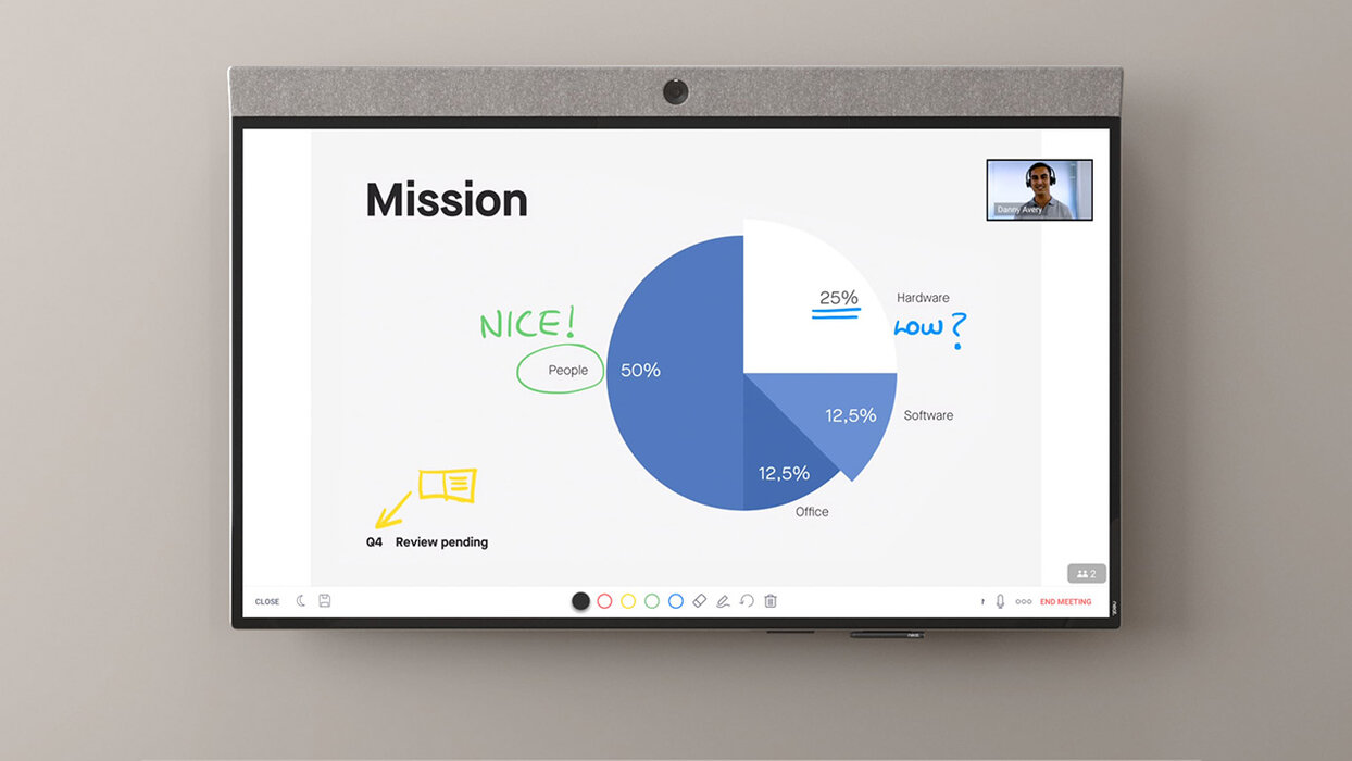 Das mit dem Red Dot ausgezeichnete Neat Board ist ein für Microsoft Teams und Zoom zertifiziertes Raumsystem für kleinere Konferenzräume mit bis zu 10 Personen.