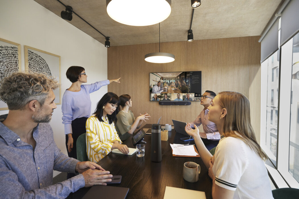 Dank der Speaker Tracking-Funktion erkennt die Kamera automatisch den aktuell sprechenden Teilnehmer und zentriert ihn in der Ansicht, damit er immer im Mittelpunkt steht. Die KI-gestützten Funktionen wie die DirectorAI-Technologie wählen automatisch die beste Ansicht für das Meeting aus, während die Live Notes-Funktion die wichtigsten Punkte des Meetings in Echtzeit aufzeichnet.