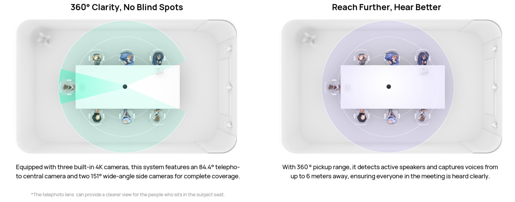 Der Yealink MTower hat drei integrierte 4K-Kamera mit Auto-Framing, die für volle 360° sorgen. Mit KI-gesteuerter Geräuschunterdrückung und hochwertigen Full-Duplex-Mikrofonen sorgt er für kristallklare Audio- und Videoqualität – perfekt für professionelle Hybrid-Meetings. Die Mikrofone haben einen Aufnahmereich von sechs Metern und ermöglichen so lebendige Meetings, in denen sich die Teilnehmer entspannt bewegen können.