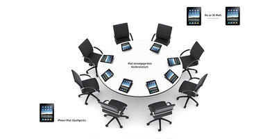 Konferenzraum: Der kompakte Medienwagen im individuell wählbaren Design bietet ein vollwertiges, mobiles Präsentationssystem mit integrierter Aufbewahrungs- und Ladestation für nahezu beliebig viele iPads.