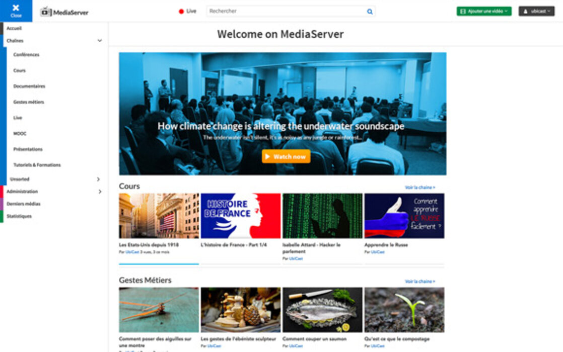 Plattform für die Bereitstellung von Rich Media-Inhalten: ein Speicher-/Streaming-Server und eine Bibliothek, die alle Medien (Fotos, lokal archivierte Inhalte oder Produktion durch UbiCast Studio & Campus-Lösungen) zentralisiert. MediaServer ermöglicht es Ihnen, diese in einem interaktiven WebTV zu organisieren und live oder on demand zu übertragen. Diese Lösung von UbiCast bietet Studenten, Kunden oder Mitarbeitern die Möglichkeit, mit jeder Art von Medien zu interagieren, diese zu filtern oder zu durchsuchen: MOOC-Module oder gemeinsame Tutorials sind jetzt sehr einfach zu erstellen.