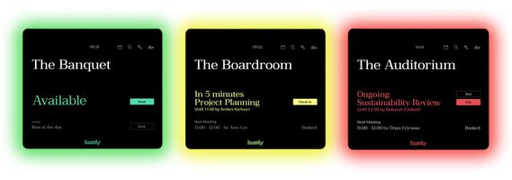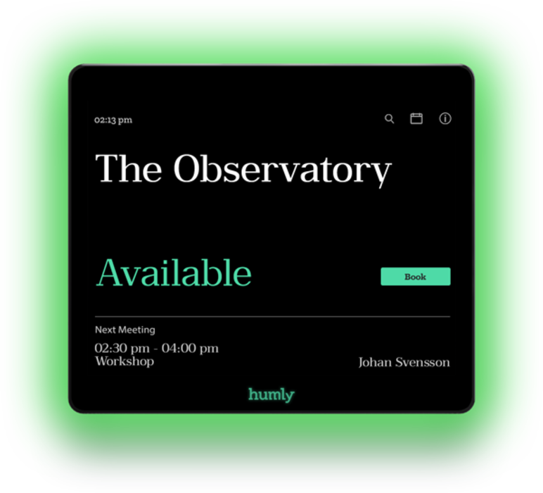 Das Humly Booking Device ist ein 3,46’’ Display, welches sich ganz einfach außerhalb von Räumen, an Schreibtischen und an Parkplätzen installieren lässt. Es zeigt mit LED Anzeigen die Vakanz des jeweiligen Raumes oder Arbeitsplatzes an und sorgt so für eine einfache Buchung über den integrierten Office 365 Kalender.