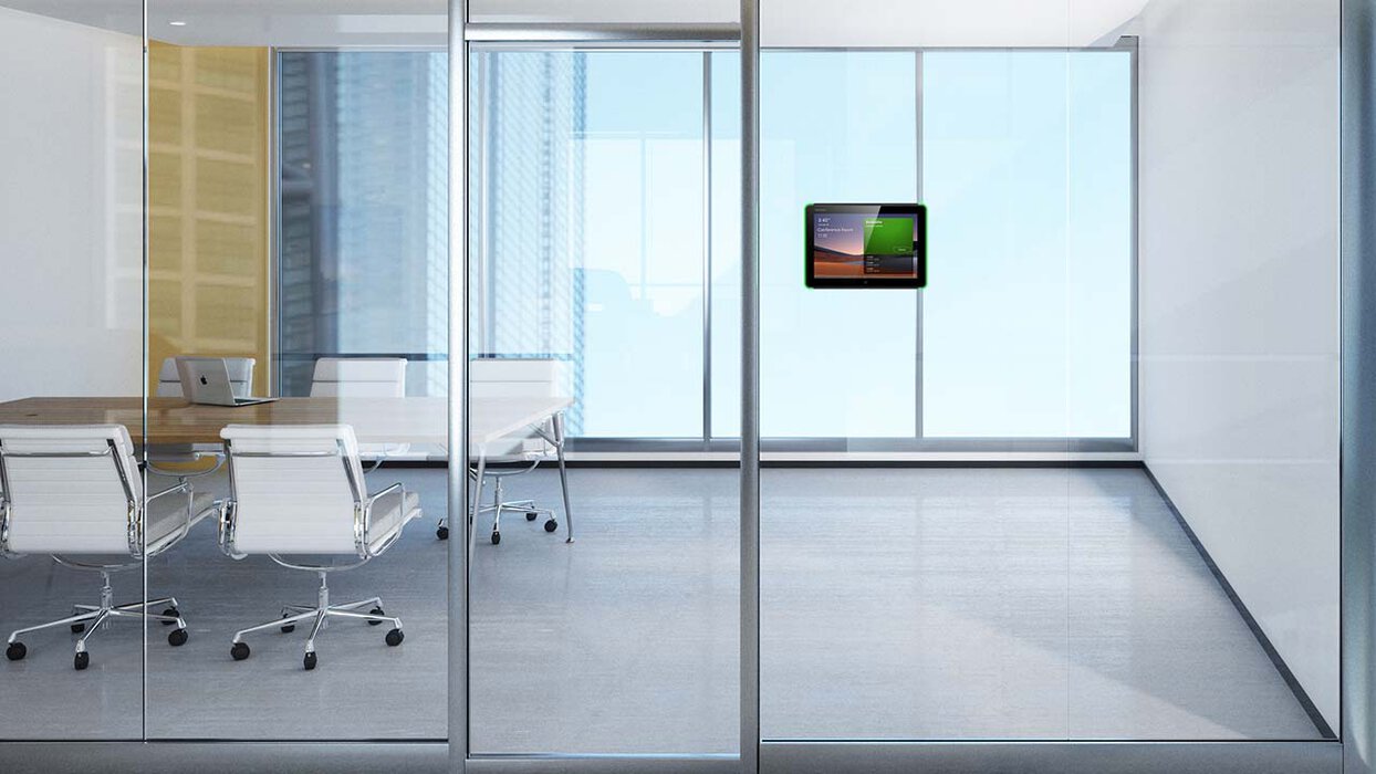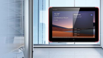 RoomPanel ist ein handlicher Touchscreen für die Montage an Meeting-Räumen mit einem modernen und eleganten Design. Der Bildschirm zeigt Besprechungsdetails an und ermöglicht Vor-Ort-Reservierungen über Teams oder Outlook 365-Kalenderanwendungen.