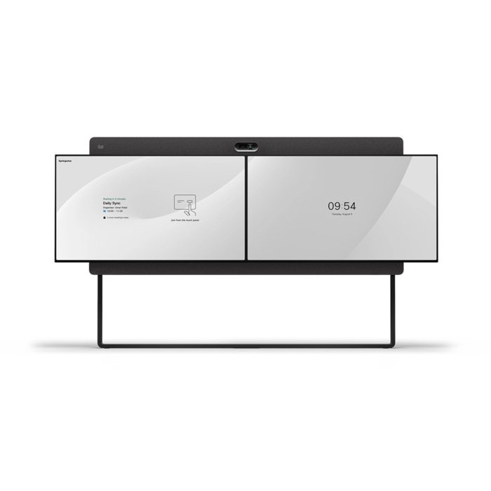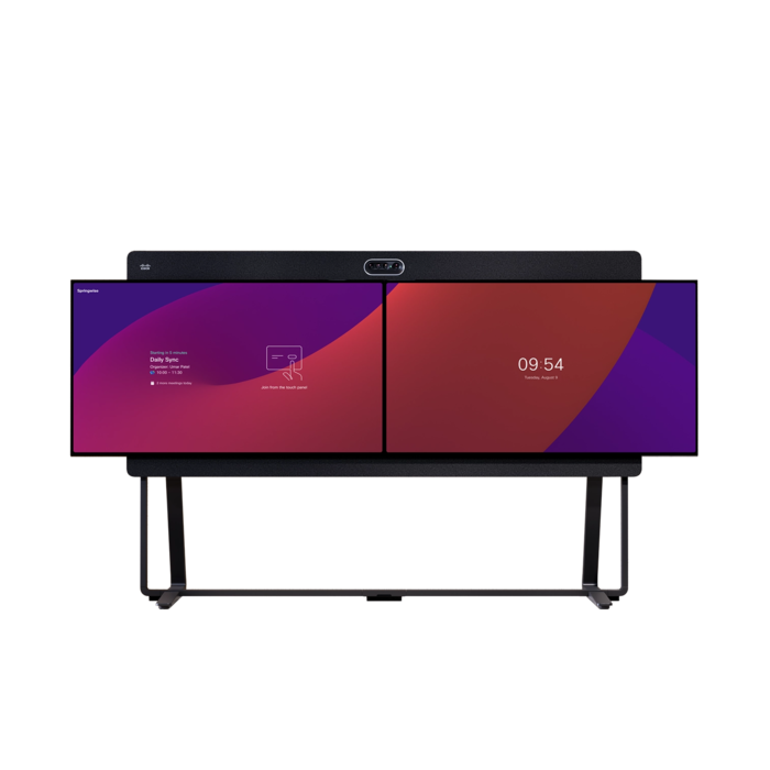 Dank der Dual-Display-Funktionalität eignet sich das Raumsystem auch für große Arbeitsgruppen und bietet stets eine geräumige Fläche für Videokonferenzen, Whiteboarding und Brainstorming. So kann auf einem Display die Konferenz laufen, während auf dem zweiten Inhalte geteilt werden können.
