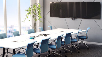 Das Poly Studio Large Room Kit ist ein Raumsystem für große Konferenzräume. Es besteht aus der 4K-Kamera Poly Studio E70 und dem Poly TC10, einem Touch-Controller. Kombiniert man es mit dem HP Mini PC, kann das Poly Studio Large Room Kit zu einem nativen Microsoft Teams Rooms oder Zoom Rooms-System werden.