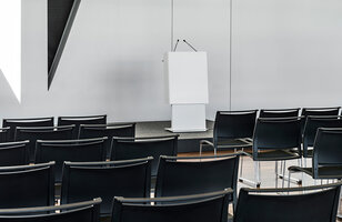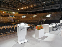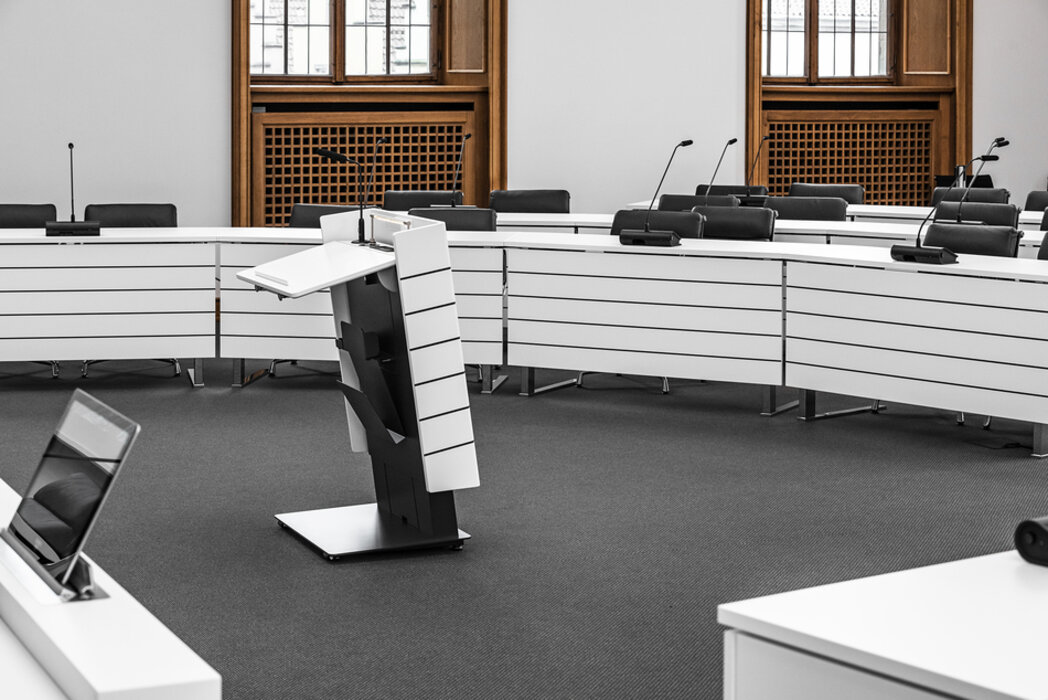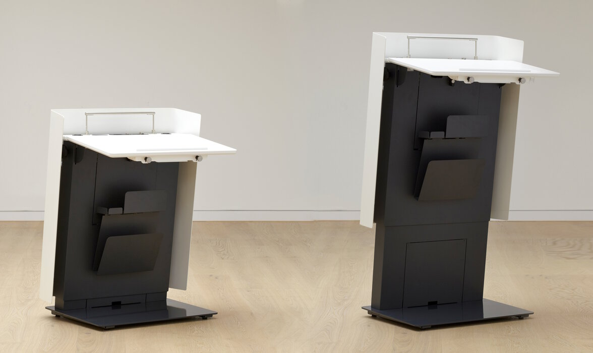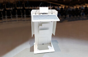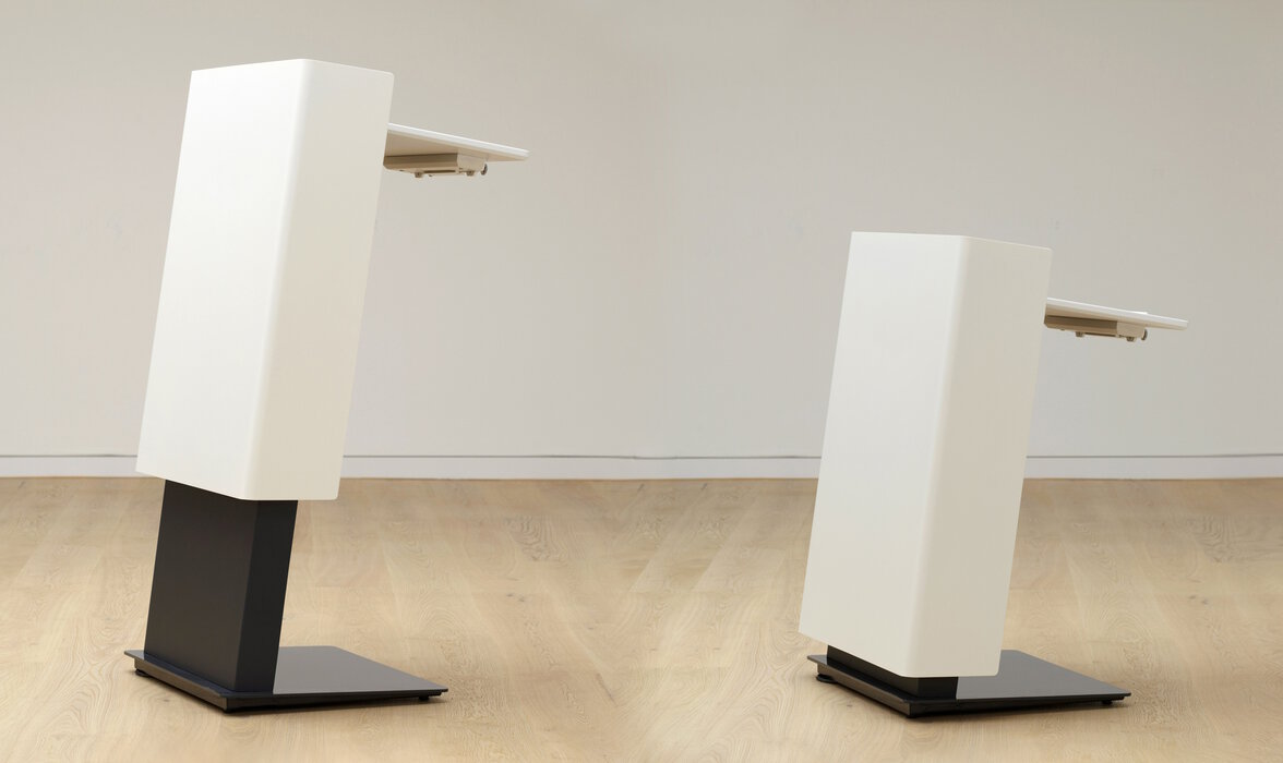 Mit seiner zurückhaltenden Optik unterstreicht es den formalen Charakter und lenkt den Fokus auf Redende. Die umkleidete Aluminiumschürze unterstützt diese ruhige Wahrnehmung und den repräsentativen Anspruch einer Business-Class. Mit LED Beleuchtung, 230V Anschluss und Ton/Bild Interfaces erfüllt es alle Anforderungen eines modernen Rednerpultes. Ausreichend Platz im Innenraum ermöglicht notwendige technische Installationen unterzubringen. Die Mikrofone finden in entkoppelten Halterungen einen sicheren Platz.