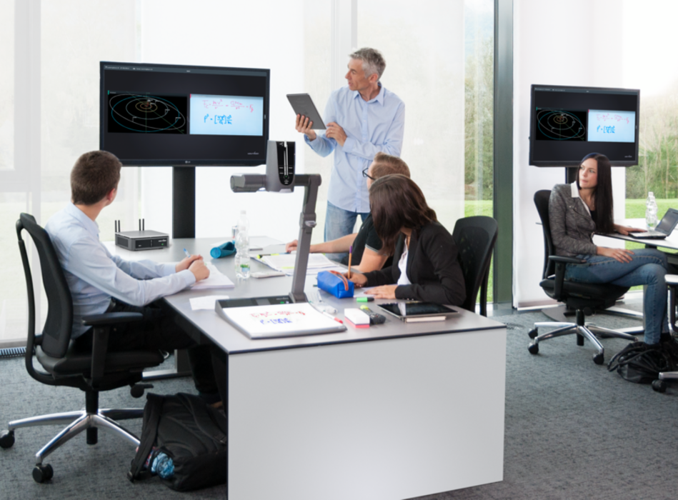Die integrierte Room View bietet eine übersichtliche Darstellung aller Stationen im Raum während sich Inhalte per Drag & Drop zwischen einzelnen Bildschirmen oder Arbeitsplätzen verschieben oder freigeben lassen. Bildschirme können beispielsweise links oder rechts gruppiert werden, sodass z.B. Dozenten Inhalte gezielt an bestimmte Arbeitsbereiche senden können.