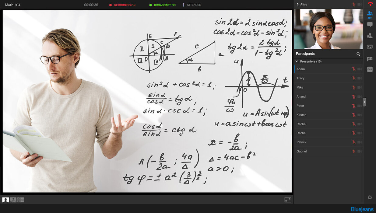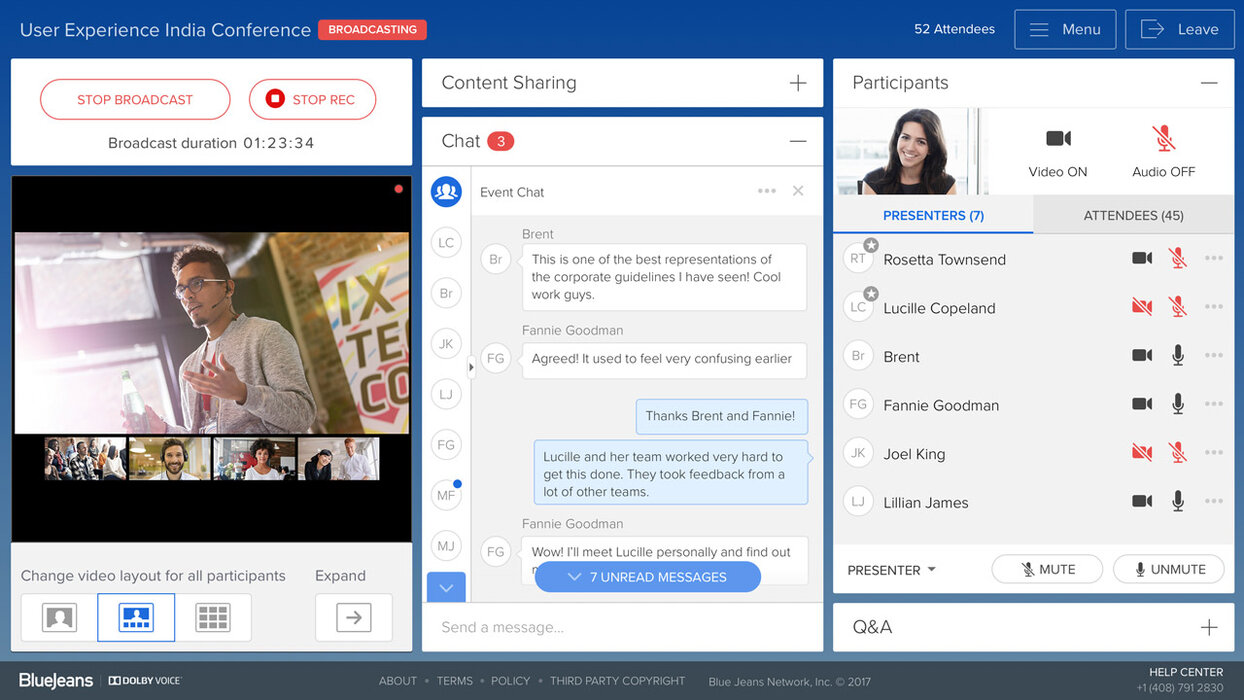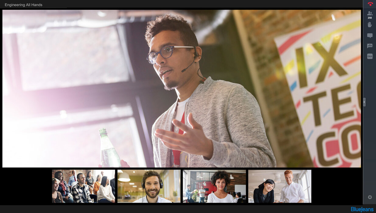 BlueJeans Events unterstützt bis zu 15.000 Teilnehmern und 100 aktiv Vortragende bei einer Live-Veranstaltung. So können Sie interaktive Webinare, Schulungen und offene Diskussionsforen zuverlässig veranstalten. Die
