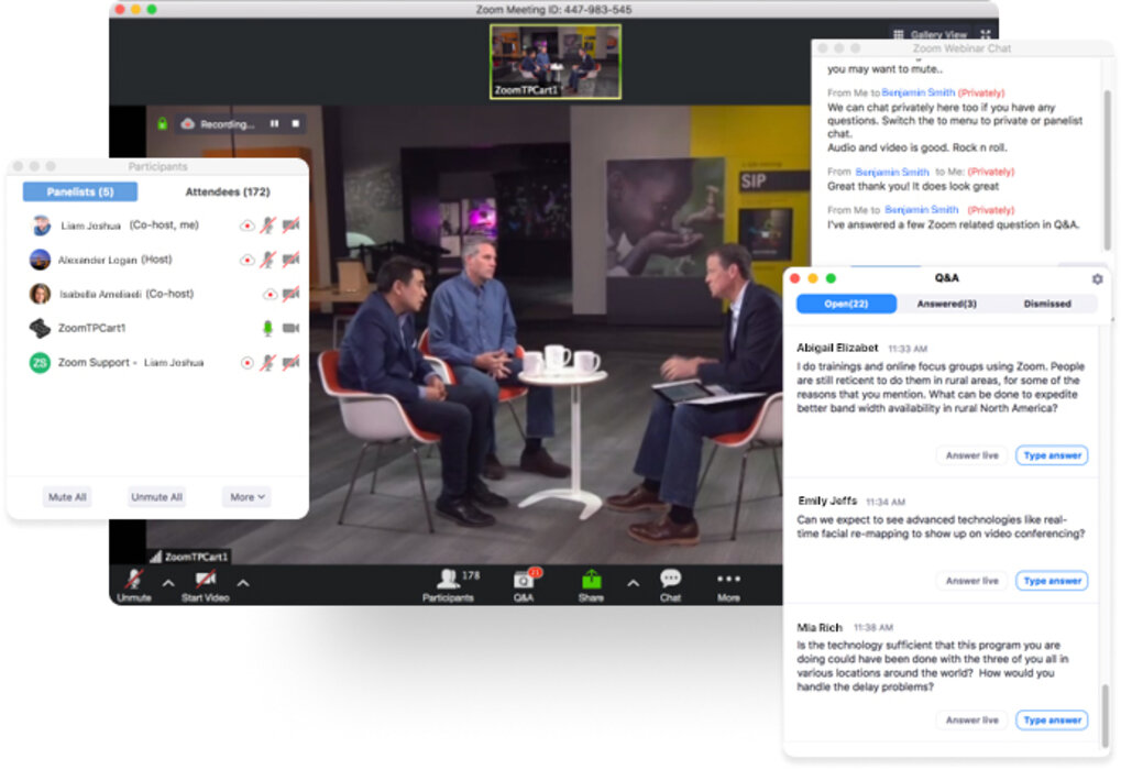 Videokonferenzen von Zoom zeichnet sich besonders über die Multimedia- und Interaktivitätsfunktionen aus. Sie können die Einstellungen für den privaten und Gruppen-Chat für Teilnehmer und Diskussionsteilnehmer festlegen, die Beteiligung der Teilnehmer steigern, indem Sie virtuelles Handraising ermöglichen und verfolgen wie engagiert Ihr Publikum mit Ihren Inhalten ist und welche Zuschauer das meiste Interesse zeigen. Zudem verwalten und teilen Sie die Eingaben des Publikums im Q&A-Dialogfeld, in dem die Teilnehmer Fragen mit Live- oder Textantworten stellen.