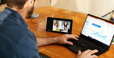 Mit ThinkSmart View erhalten Sie ein dediziertes Gerät für die Teams Videotelefonie. Es verfügt über eine integrierte Kamera und Fernfeld-Mikrofone. Die Anbindung an Ihren PC und eventuelle Kopfhörer findet per Bluetooth und WiFi statt. Das Videotelefon ermöglicht eine einfache Bedienung per One-Click-to-Join Button. ThinkSmart View deckt somit alle Anforderung für Videokonferenzen kompakt und benutzerfreundlich ab.