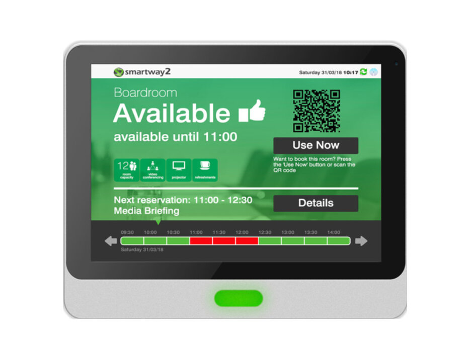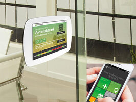 Desk Booking Panels – Eine einfache, elegante Lösung, welche die Verfügbarkeit und bestehende Buchungen anzeigt - und Ihnen gleichzeitig ermöglicht, einen Tisch für jetzt oder später zu reservieren. Funktioniert mit Handy und RFID.